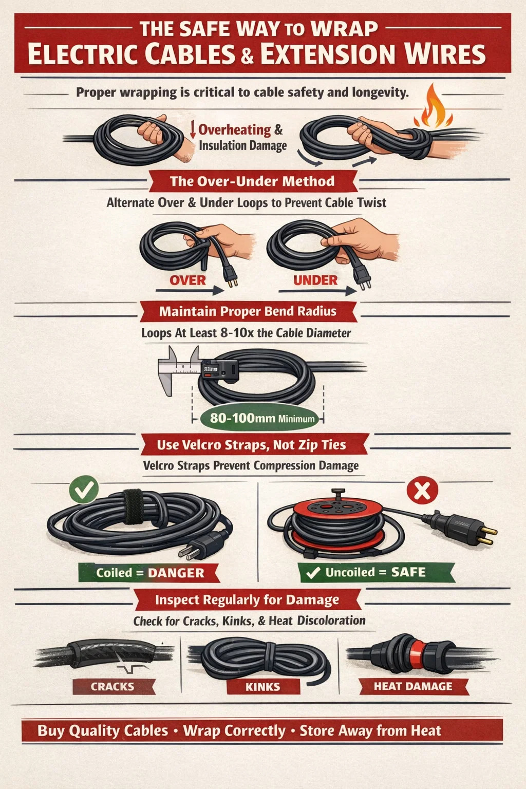- Enrollar los cables firmemente alrededor de las manijas del equipo: Muchas personas enrollan cables de extensión firmemente alrededor del mango de una herramienta eléctrica o una aspiradora para guardarlos. El estrecho radio en los puntos de enrollado y la presión de la propia tensión del cable provocan una deformación persistente.