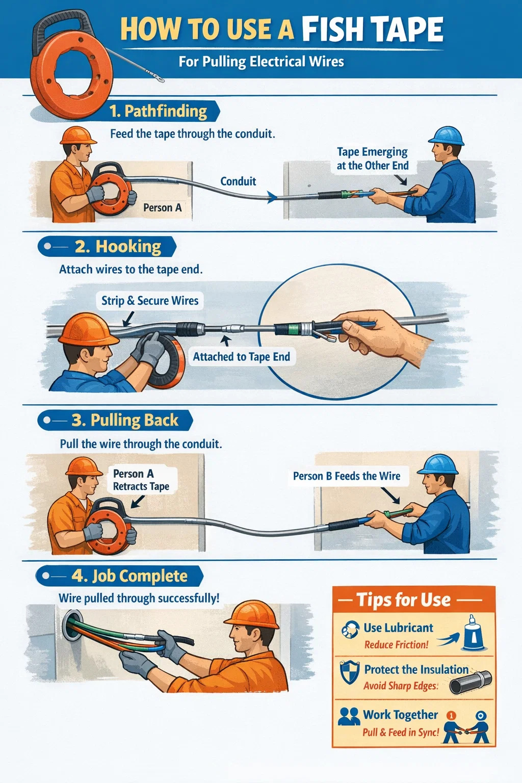 Using a fish tape usually requires two people working together. The process involves the following simple steps: