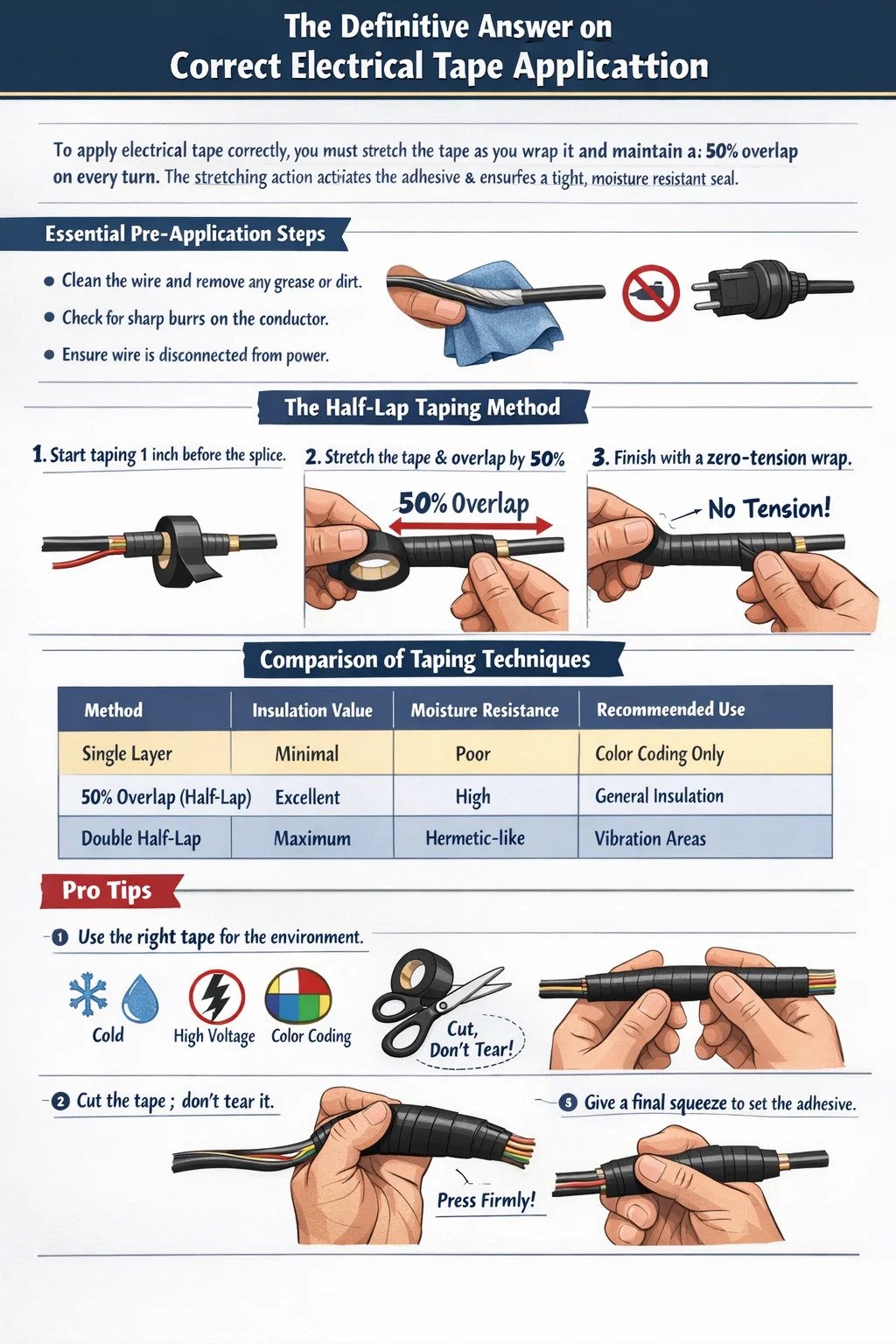 El estándar de oro para el vendaje es el de "media vuelta". Esto significa que cada vuelta posterior de la cinta cubre exactamente la mitad de la vuelta anterior. Esto no es sólo una sugerencia; es un requisito estructural para la integridad eléctrica.