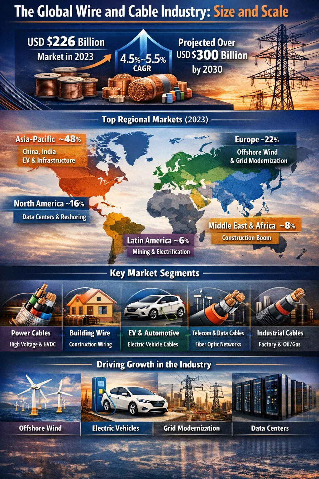 La industria de alambres y cables es uno de los sectores manufactureros más grandes del mundo. El mercado mundial de alambres y cables se valoró en aproximadamente 226 mil millones de dólares en 2023 , y los analistas proyectan que superará los 300 mil millones de dólares para 2030, creciendo a una tasa de crecimiento anual compuesta (CAGR) de alrededor del 4,5% al 5,5%, según el segmento. Esta escala hace que la industria sea comparable en ingresos al sector global de equipos semiconductores y significativamente más grande que muchas otras industrias manufactureras conocidas.