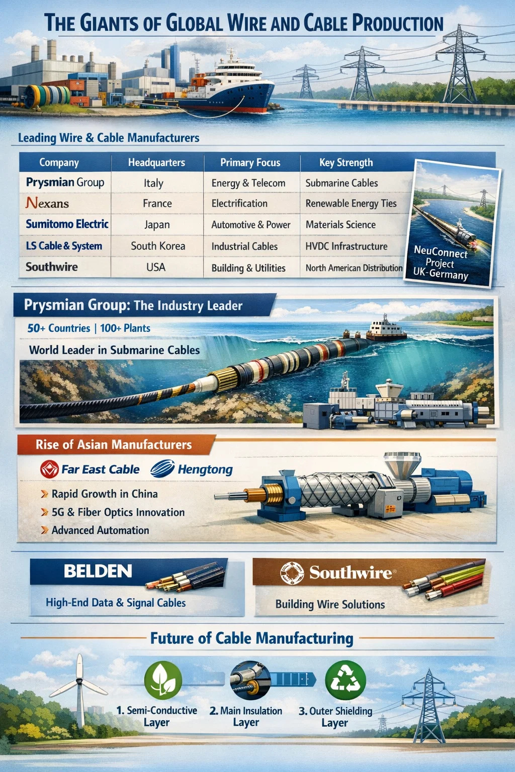 Son particularmente dominantes en el sector de los cables submarinos. Proyectos como el enlace "NeuConnect" entre el Reino Unido y Alemania demuestran su capacidad para producir miles de kilómetros de cable especializado que debe resistir la presión extrema del océano y los ambientes salinos corrosivos durante décadas.