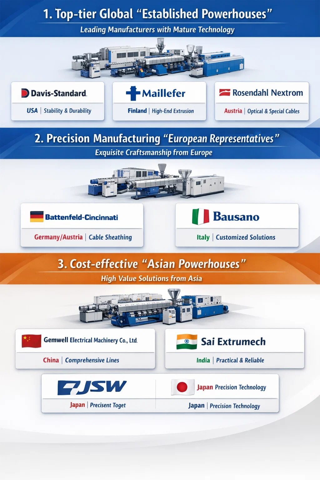 Estos fabricantes suelen tener décadas o incluso siglos de historia, poseen tecnología muy madura y suministran principalmente a fábricas de cables a gran escala con exigencias extremadamente altas en cuanto a la calidad del cable.
